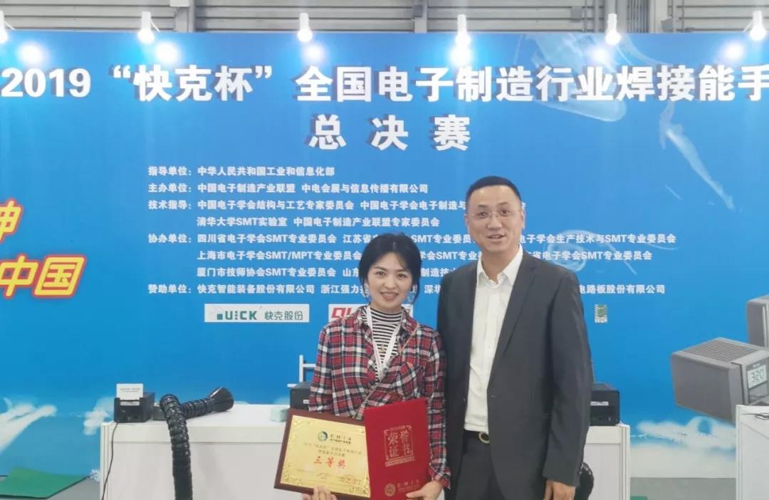 日前,2019年“快克杯”全國電子制造行業(yè)焊接能手總決賽在上海新國際博覽中心舉辦。成都航天電子裝調(diào)事業(yè)部侯本麗同志榮獲季軍。