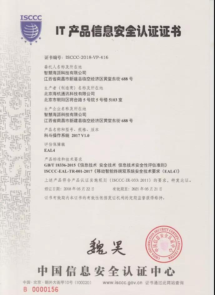 經過多方歷時半年的共同努力,智慧海派科技有限公司送檢的科斗操作系統(Tadpole OS 2017/V1.0)通過了信息產業信息安全測評中心有關移動智能終端雙系統的EAL4級認證檢測,于2018年6月份順利獲得了中國網絡安全審查技術與認證中心(原中國信息安全認證中心)的EAL4級的信息安全認證證書,這是中國網絡安全審查技術與認證中心針對非智能卡類IT產品頒發的首張EAL高級別信息安全認證證書。
