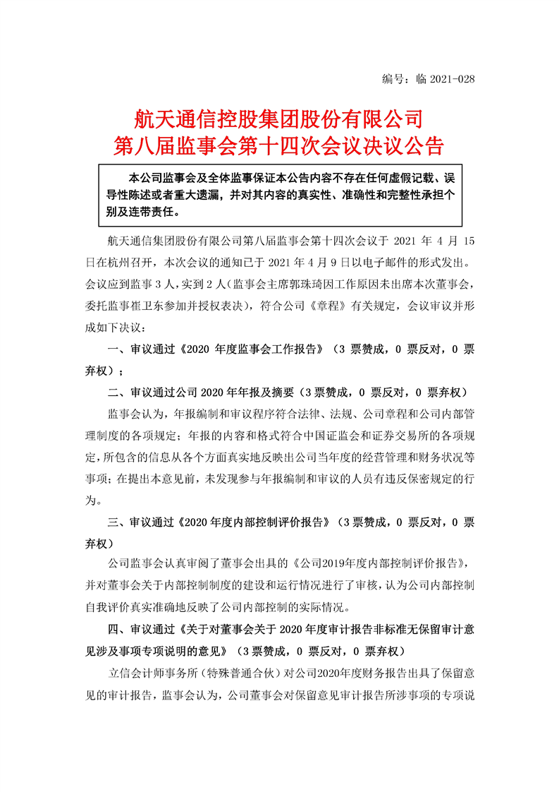 航天通信控股集團股份有限公司八屆十四次監事會決議公告
