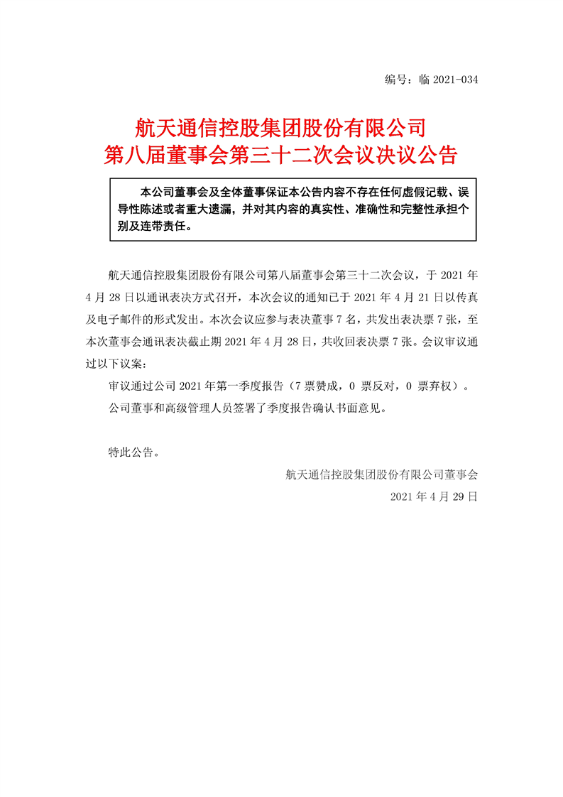 航天通信控股集團股份有限公司八屆三十二次董事會決議公告