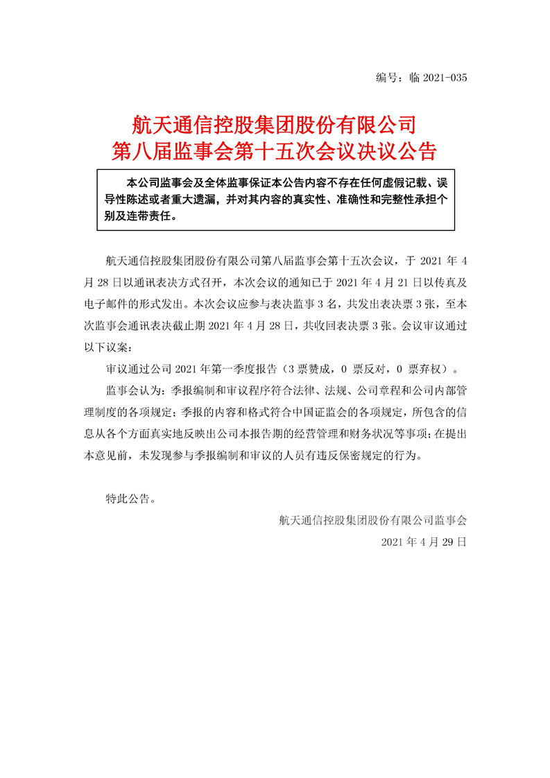 航天通信控股集團(tuán)股份有限公司八屆十五次監(jiān)事會(huì)決議公告