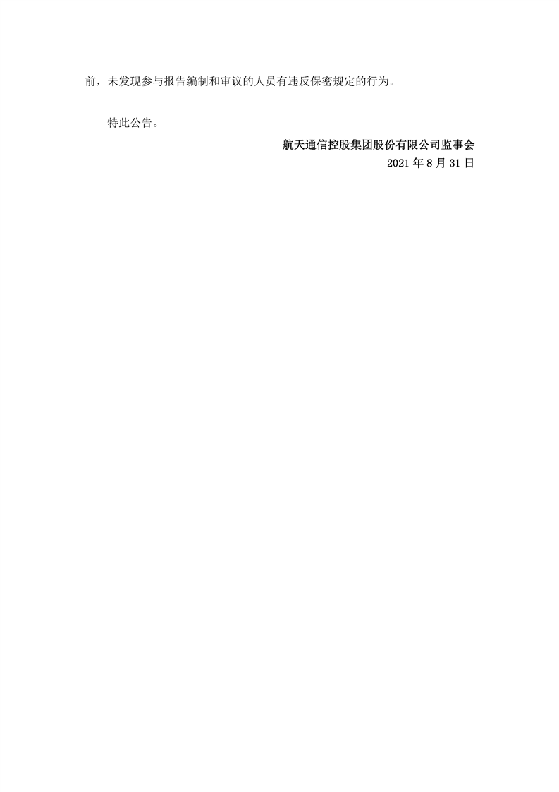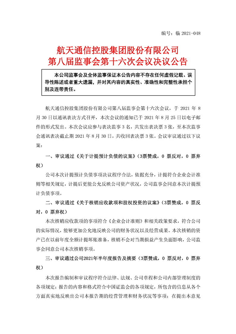 航天通信控股集團(tuán)股份有限公司八屆十六次監(jiān)事會(huì)決議公告